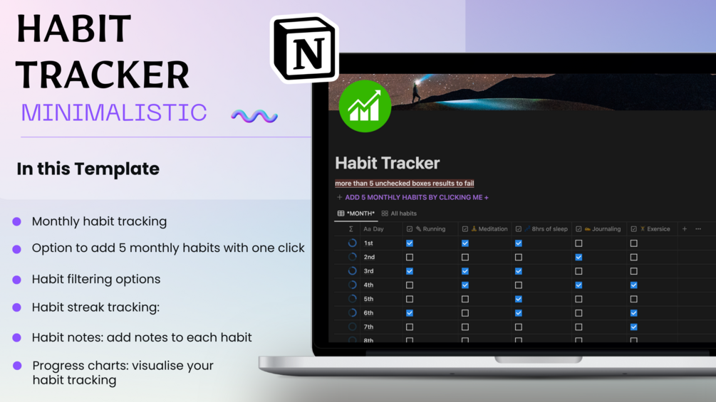 This Notion template for habit tracking is designed to help you develop and maintain healthy habits. With monthly habit tracking, you can easily monitor your progress over time. The template allows you to add up to 5 or more monthly habits with just one click, making it easy to set and track achievable goals. If you don't complete more than 5 unchecked habits in a month, the you may consider it as failed the habit and can add the same habit for the next month. Additionally, habit filtering options make it easy to view and organise your habits according to your preferences. This template is perfect for anyone looking to develop a daily routine and improve their productivity.