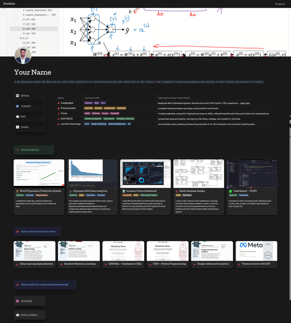 An all-in-one Notion template meticulously designed to structure and showcase your professional journey, from your education and work experience to your standout projects and skills.