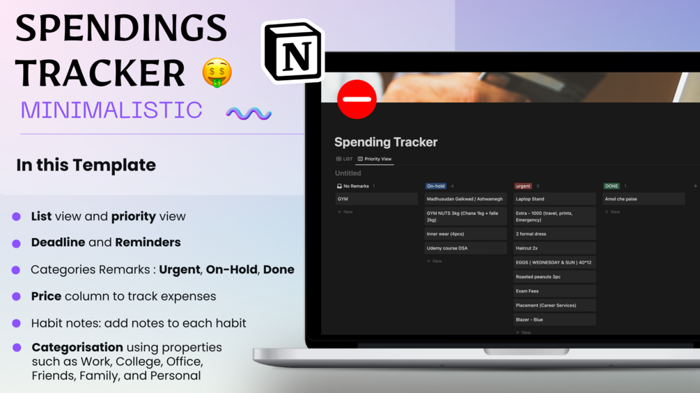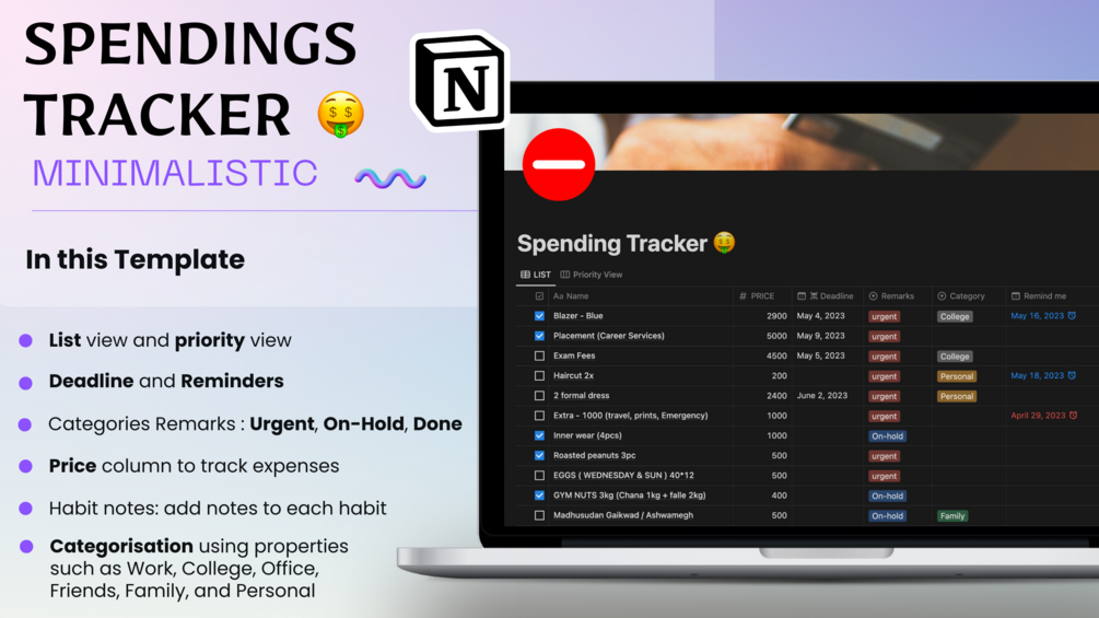 The Spending Tracker Notion template is a powerful tool that helps users track their expenses efficiently. The template has various features, including two different views: list view and priority view. It allows users to set a deadline for each task and put reminders to ensure that the task is completed on time. Users can add remarks to each expense, which are divided into three categories: urgent, on-hold, and done.
